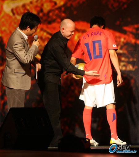 13일 오후 서울 삼성동 코엑스 아셈타워 그랜드 볼룸에서 열린 2006 국가대표 축구팀 유니폼 발표회가 열렸다. 유니폼을 제작한 디자이너가 모델이 입고 있는 상의 아래쪽에 '투혼'이라고 새겨진 글씨를 가리키고 있다./박영태 기자 ds3fan@osen.co.kr [Copyright ⓒ 한국 최고의 스포츠 전문 미디어 OSEN(www.osen.co.kr) 무단전재 및 재배포 금지]