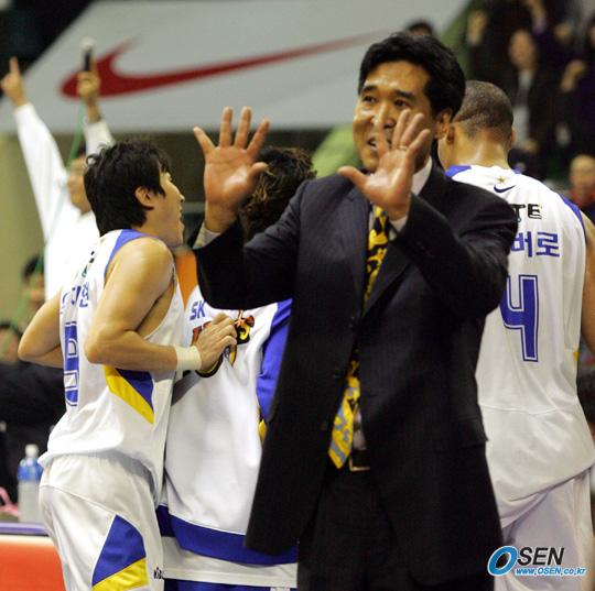 14일 잠실학생체육관에서 벌어진 2005-2006 KCC 프로농구 서울 SK와 창원 LG의 경기서 84-84로 연장전을 치르게 되자 LG의 신선우 감독과 뒤로 보이는 SK 선수 등 양측이 모두 반기고 있다./잠실학생체=주지영 기자 jj0jj0@osen.co.kr [Copyright ⓒ 한국 최고의 스포츠 엔터테인먼트 전문 미디어 OSEN(www.osen.co.kr) 무단전재 및 재배포 금지]