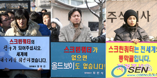 영화인들의 시위에는 '뭔가 특별한 구호'가 있다. 스크린쿼터 축소 1인 반대시위를 벌이는 영화계 스타들이 저마다 개성있는 시위 피켓을 들고 거리로 나섰다. 스타들의 1인 시위는 지난 4일 스크린쿼터 사수 영화인 대책위원회 공동위원장인 안성기를 필두로 서울 광화문 교보생명 빌딩 앞에서 시작됐다. 스크린쿼터 문제에 대한 여론을 환기시키고 정부의 스크린쿼터 축소 강행을 막기위해 스타들이 시위 일선에 등장한 것이다. 여기서 동원된 게 '피켓 시위'. 영화인들은 하나같이 추운 날씨에도 불구하고 스크린쿼터 축소에 반대하는 문구가 적힌 피켓을 들었다. 개방된 공간에서 긴시간 동안 효율적으로 자신의 의지를 알리는 도구로 피켓을 선택했다. 피켓에 적힌 문구들은 대부분 배우들이 시위 전날까지 직접 아이디어를 내거나 스크린쿼터 사수 영화인 대책위원회에 소속된 관계자들이 모여 상의해 결정한다. 그렇기 때문에 시위자로 나서는 영화인과 관련된 영화제목을 이용, 문구를 쓴 것들이 눈에 띈다. 지난 6일 장동건은 '스크린쿼터의 친구가 되어주십시오. 세계에 태극기를 휘날리겠습니다'라는 문구가 적힌 피켓을 들었다. 다음 날 최민식은 '스크린쿼터가 없으면 올드보이도 없습니다', 10일 강혜정은 '스크린쿼터는 전세계의 동막골입니다. 지켜주세요', 11일 이준익 감독은 '스크린쿼터가 왕의 남자를 만들었습니다'라고 피켓에 적어 1인 시위를 벌였다. 특이한 점은 문구에 언급된 영화들이 모두 흥행에 성공한 작품들로 정부의 스크린쿼터 축소에 당위성으로 거론된다는 사실. 1174만 관객의 나 800만 관객의 그리고 최근 개봉 45일만에 1000만 관객을 뛰어넘은 등은 할리우드 거대자본과의 대결에서 압승을 거두며 한국영화의 경쟁력을 입증한 영화들이다. 그만큼 영화인들의 1인 시위를 곱지 않게 보는 시선이 존재한다. 최근 한 여론 조사에서 국민의 53%만이 정부의 스크린쿼터 축소 방침에 반대한다는 것을 보더라도 잘 알 수 있다. 축소 방침에 찬성표를 던진 의견은 34%, 모르겠다는 응답은 14%였다. 이를 의식한 듯 이준익 감독은 시위현장에서 "스크린쿼터란 좋은 제도가 경제논리에 의해 축소된다면 왕의 남자 같은 영화를 만들 환경이 어렵다. 과연 어떤 투자자가 눈에 보이는 흥행 요소가 없는 영화에 과감히 투자하겠느냐"며 단순히 결과론적인 관객수로 한국영화가 튼튼하다는 섣부른 판단을 말아줄 것을 부탁했다. 그래서 이들의 문구는 일반적인 시위 현장에서 볼 수 있는 '~을 해라'와 같은 명령조의 강한 글귀보다, 한 발 물러나 국민들에게 호소하는 형태를 띄고 있다. 이준기는 '이제 시작입니다. 여기서 멈출 수는 없습니다. 스크린쿼터를 지켜주세요'라고 했다. 또 박해일은 '스크린쿼터가 전세계의 다양한 문화를 지키는 든든한 초석이 되었으면 합니다'라고 스크린쿼터 문제에 대해 '부드럽게' 자신의 견해를 밝혔다. 한미 자유무역협정(FTA) 협상을 위해 스크린쿼터 축소 카드를 사전에 꺼낸 정부. 이에 반발해 스크린쿼터 사수를 주장하며 1인 시위를 벌이고 있는 영화인들. 그리고 이 사이에서 신중한 마음으로 바라보고 있는 국민들. 과연 영화인들이 피켓에 적은 바람이 국민에게 전달되어 여론의 지지를 이끌어 낼 수 있을까. 강성곤 기자 sunggon@osen.co.kr [Copyright ⓒ 한국 최고의 스포츠 엔터테인먼트 전문 미디어 OSEN(www.osen.co.kr) 무단전재 및 재배포 금지]