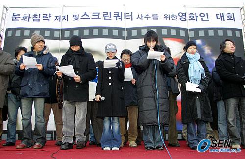 영화인들이 다시 거리로 나선다. 이번엔 촛불시위로 농민들과 함께다. 스크린쿼터 사수 영화인 대책위원회는 15일 한미 자유무역협정(FTA)의 부당함을 알리고 스크린쿼터를 사수하기 위해 농민들과 손을 잡고 '쌀과 영화'라는 주제로 17일 오후 6시부터 8시까지 서울 시청 앞 광장에서 촛불문화행사를 연다고 밝혔다. 정부가 오는 7월 1일부터 한국영화 의무상영제인 스크린쿼터를 현행 146일에서 73일로 축소하겠다고 발표한 것에 반발한 영화인들의 단체 시위가 농민단체와의 세 규합에 들어간 것이다. 영화인들의 집단 행동은 지난 8일의 서울 광화문 동화면세점 앞 시위에 이어 두 번째이다. 이날 촛불시위에는 안성기 장동건 최민식 이준기 등 그간 1인 시위에 나선 배우들이 모두 참여하며 김장훈 전인권 정태춘 등 가수들과 박성호 박휘순 김대범 등 개그맨들이 영화인들을 지지하는 공연을 할 예정이다. 또한 영화인 대책위는 이날 행사에 참석한 시민들에게 1인 시위에 참석했던 배우, 감독들의 발언과 싸인이 적힌 손수건을 배포하며 지지를 호소할 계획이다. 강성곤 기자 sunggon@osen.co.kr 지난 8일 광화문 동화면세점 앞에서 있었던 영화인 첫 집단 시위 모습. [Copyright ⓒ 한국 최고의 스포츠 엔터테인먼트 전문 미디어 OSEN(www.osen.co.kr) 무단전재 및 재배포 금지]