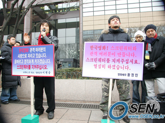 이현승 감독이 영화인들의 스크린쿼터 사수 1인 시위를 곱지 않게 바라보는 국민들의 시선을 의식한 듯 영화인을 대표해 사과를 해 눈길을 끌었다. 이 감독은 배우 황정민과 함께 11번째 1인 시위 주자로 15일 오후 1시 서울 광화문 교보생명 빌딩 앞에 섰다. 1인 시위 시작에 앞서 마이크를 잡은 이 감독은 "한국 영화가 잘 된지 얼마 되지 않아 현장 스태프의 처우개선 노력이나 영화산업에 대한 전반적인 연구를 시도하지 못했다. 이는 영화계 문제를 돌아볼 여력이 없었기 때문이다"고 밝힌 뒤 "영화는 국민들의 지지와 힘이 없다면 만들어 지지 않는 다는 것을 알았다. 국민들게 사죄한다"며 머리를 숙였다. 최근 한 여론조사에서는 조사대상의 절반 정도만이 정부의 스크린쿼터 축소에 반대한다고 밝히는 등 인터넷을 중심으로 영화인들의 행동에 대한 비난 여론이 일고 있는 것이 사실이다. 이 감독의 발언 이후 황정민은 1시 반부터 현장에 모인 300여명의 시민들에게 "열심히 하겠습니다"란 말로 시위를 시작하였다. '한국영화! 스크린쿼터와 관객여러분이 만듭니다. 스크린쿼터를 지켜주십시오. 열심히 하겠습니다'라고 적힌 피켓을 든 황정민은 일종의 '침묵 시위'를 벌였다. 취재진의 다양한 질문에도 '배우로서 연기를 열심히 할테니 긍정적으로 봐달라'는 정도로 짧게 답하며 '침묵'으로 스크린쿼터 사수 의지를 보였다. 강성곤 기자 sunggon@osen.co.kr 이현승 감독이 시위에 앞서 마이크를 잡고 국민에 대한 사과의 메시지를 전하고 있다. /사진=주지영 기자 jj0jj0@osen.co.kr [Copyright ⓒ 한국 최고의 스포츠 엔터테인먼트 전문 미디어 OSEN(www.osen.co.kr) 무단전재 및 재배포 금지]