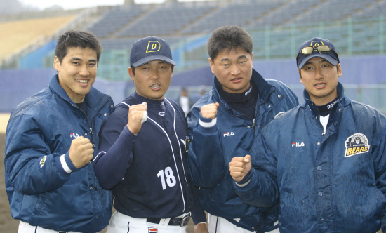 다음달 3일 시작된는 월드베이스볼클래식(WBC)에 두산은 김동주 홍성흔 박명환 정재훈 등 4명이 출전한다. 8개 구단 중 삼성(6명) 다음으로 많을 뿐 아니라 클린업 트리오-포수-선발 요원 등 차지하는 비중도 크다. 일본 쓰쿠미에서 전지훈련 중인 이들 4인방의 각오는 단단하다. 김동주는 "그동안 국가대표로 많이 뛰었지만 그 때마다 큰 책임감을 느낀다. 특히 이번 WBC는 나라를 대표하는 선수들끼리 겨루는 명실상부한 국가대항전이어서 더 큰책임감을 느낀다"며 "한편으론 새로운 분위기, 상대 팀에 대한 궁금증 떄문에 설레기도 한다"고 말했다. 김동주는 "작년 연말부터 꾸준히 몸을 만들어왔다. 어느 때보다도 운동을 열심히 했기 떄문에 현재 몸 상태가 아주 좋은 편"이라며 "장타도 중요하지만 이번 대회 1차 목표인 2라운드 진출을 위해 철저하게 팀 배팅을 하겠다"고 다짐했다. 홍성흔은 "홍성흔의 이미지는 파이팅과 허슬 플레이다. WBC에서도 내 이미지를 보여줄 것"이라며 두산의 '오버맨'에서 대표팀 분위기 메이커로 변신을 벼르고 있다. "이번 국가 대표는 최고의 선수들이 포진한 역대 최강의 드림팀이다. 스타 선수들이 많이 있는 만큼 팀을 생각하는 분위기를 만들 수 있도록 힘쓰겠다"는 다짐이다. "비시즌 동안 강도 높은 웨이트 트레이닝을 했다. 내가 스스로 봐도 몸이 달라진 걸 느낀다"는 홍성흔은 "오른쪽 발목이 조금 아프긴 하지만 부상이라고 하기 힘들다. 3월 3일 대만전에 최상의 컨디션을 맞출 수 있다"고 장담했다. 1라운드 선발 등판이 유력한 박명환은 이번이 지난 2002년 부산 아시안게임 이후 두번째 국가대표 선발이다. "책임감을 느끼지만 부담스럽지는 않다"는 박명환은 "편하게 경기에 임하겠다. 돔구장에선 처음 경기를 해보는데 재미있을 것 같다. 경기를 즐기겠다"고 말했다. 어머니 송영심씨가 갑상선암 판정을 받아 쓰쿠미 캠프에 뒤늦게 합류하기도 했던 박명환은 "어머니에게 좋은 경기 모습을 보여드리고 싶다"는 말로 대회에 임하는 각오를 대신했다. 마무리 정재훈은 "쟁쟁한 선수들과 함께 큰 무대에서 경기를 치루는 만큼 배우는 자세로 임하겠다"며 "좋은 선수들과 겨루게 돼 내 야구 인생에 큰 도움이 될 것 같다"고 기대하고 있다. 지난 15일 자체 청백전에서 처음으로 실전 등판(1이닝 2피안타 1볼넷)을 한 정재훈은 "오랜 만에 실전 피칭을 해 썩 좋지 않았다. 일본이나 대만 타자들을 상대해본 (박)명환이형과 많은 얘기를 나누고 있다"며 "한국의 승리를 위해 어떤 역할이 맡겨지든 최선을 다하겠다"고 말했다. 김동주와 홍성흔 박명환 정재훈은 오는 19일 쓰쿠미 캠프를 떠나 대표팀이 소집 훈련을 시작하는 후쿠오카로 이동할 예정이다. 월드베이스볼클래식에 출전할 두산 선수 4명이 함께 모여 선전을 다짐하고 있다. /두산 베어스 제공 이종민 기자 mini@osen.co.kr [Copyright ⓒ 한국 최고의 스포츠 엔터테인먼트 전문 미디어 OSEN(www.osen.co.kr) 무단전재 및 재배포 금지]
