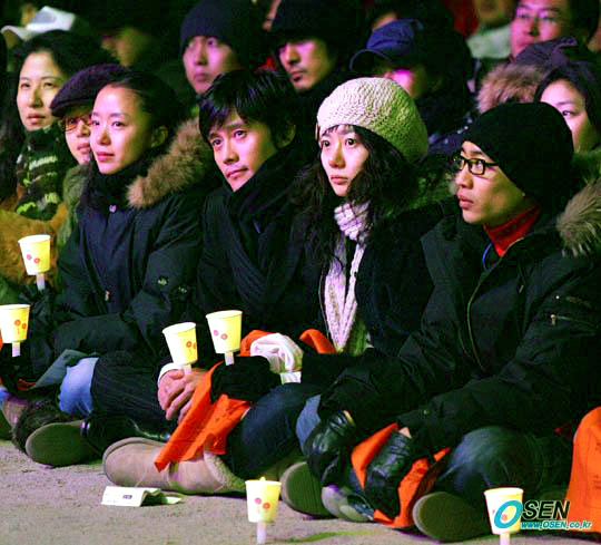 스크린쿼터 지키기 1인시위에 나섰던 톱스타들과 가수 개그맨 농민들이 함께하는 촛불문화제 '쌀과 영화'가 17일 오후 6시 서울 광화문 시민열린광장에서 열렸다. 김혜수,전도연,이병헌,배두나가 나란히 앉아 있다./광화문=주지영 기자 jj0jj0@osen.co.kr [Copyright ⓒ 한국 최고의 스포츠 엔터테인먼트 전문 미디어 OSEN(www.osen.co.kr) 무단전재 및 재배포 금지]