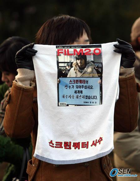 스크린쿼터 지키기 1인시위에 나섰던 톱스타들과 가수 개그맨 농민 등이 함께하는 촛불문화제 '쌀과 영화'가 17일 오후 6시 서울 광화문 시민열린광장에서 열렸다. 1인 시위하는 장동건의 사진으로 수건을 만든 팬이 스크린 쿼터 사수라는 문구를 들고 있다./광화문=박영태기자 ds3fan@osen.co.kr [Copyright ⓒ 한국 최고의 스포츠 엔터테인먼트 전문 미디어 OSEN(www.osen.co.kr) 무단전재 및 재배포 금지]