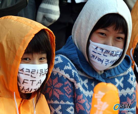 스크린쿼터 지키기 1인시위에 나섰던 톱스타들과 가수 개그맨 농민이 함께하는 촛불문화제 '쌀과 영화'가 17일 오후 6시 서울 광화문 시민열린광장에서 열렸다. 소녀 팬들이 '스크린쿼터를 지켜달라'고 적힌 마스크를 쓰고 시위에 동참하고 있다./광화문=박영태기자 ds3fan@osen.co.kr [Copyright ⓒ 한국 최고의 스포츠 엔터테인먼트 전문 미디어 OSEN(www.osen.co.kr) 무단전재 및 재배포 금지]
