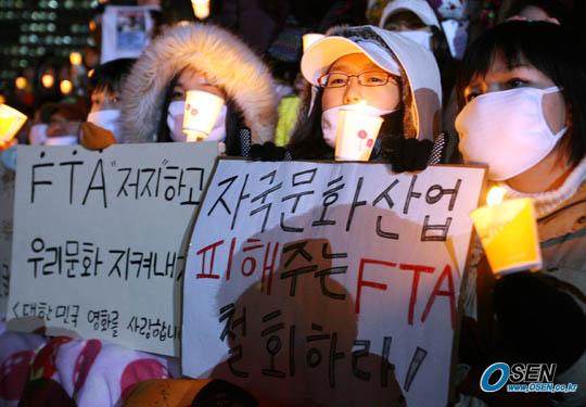 17일 오후 6시부터 9시까지 스크린쿼터를 사수하고 한미FTA를 저지하기 위해 서울 광화문 시민열린광장에 모인 영화인들과 농민들이 '쌀과 영화'란 이름으로 촛불문화행사를 가졌다. 세 시간 가량 이어진 행사의 이모저모. ○ 지난 8일 영화인들만의 단독 시위가 열린 서울 광화문 동화면세점 앞. 약 2000여 명의 시위자들이 모인 이날은 체감온도가 영하 15도까지 내려가는 강추위였다. 17일 농민과 영화인 3000여 명이 함께 한 촛불문화행사도 며칠간 포근했던 날씨와 다르게 강한 바람이 부는 제법 쌀쌀한 날씨였다. 현장에서 이날 행사를 진행하던 스크린쿼터 문화연대의 한 관계자는 "원래 추울수록 정신을 바짝 차리기 때문에 문제없다"며 "하늘이 오히려 스크린쿼터 사수를 위해 질기게 싸우라고 도와주는 것 같다"고 말했다. ○ 이날 사회자로 단상에 오른 영화배우 공형진이 행사도중 영어로 진행해 눈길을 끌었다. 영화배우 안성기와 문경식 전국농민총연맹 의장의 연설문 낭독을 현장에 모인 외신을 위해 준비된 영문을 읽은 것. 행사를 보기 위해 모인 많은 시민들은 처음에는 어색해 하며 웃었지만 공형진의 유창한 발음과 진지한 태도에 함성을 지르고 박수를 치며 격려했다. ○ 이날 행사장 한쪽에는 마치 개인 가수의 콘서트를 연상케 하는 광경이 연출됐다. 행사 도중 노래를 부르기 위해 참가한 그룹 신화의 이민우를 보기위해 모인 여성 팬 100여 명 때문이었다. 한 곳에 옹기종기 모인 이들은 주황색 비옷을 입고 응원용 막대풍선을 치며 이민우를 응원했다. 또 행사 전부터 이민우 관련 동영상이 나오거나 이민우의 이름이 거론될 때마다 환호를 해 열린시민광장을 마치 이민우 콘서트 현장으로 착각하게 만들었다. ○ 행사 전 주최 측은 그간 스크린쿼터 사수를 위해 1인 시위에 나선 영화배우들의 피켓에 쓰여 있던 문구와 배우들 각자의 싸인이 적힌 손수건을 나눠줘 눈길. 주황색 천에 검은 글씨로 가운데는 ‘쌀과 영화’와 '촛불문화제, 스크린쿼터 사수! FTA저지!'라고 적혀 있는 이 손수건은 행사에 참여한 시민에게 감사의 마음을 전하기 위해 배포했다고 주최 측은 설명했다. 하지만 준비한 수량이 넉넉지 않아 행사장 뒤편에서 손수건을 받지 못한 일부 시민들이 서로 갖기 위해 언성을 높이기도 했다. 강성곤 기자 sunggon@osen.co.kr [Copyright ⓒ 한국 최고의 스포츠 엔터테인먼트 전문 미디어 OSEN(www.osen.co.kr) 무단전재 및 재배포 금지]
