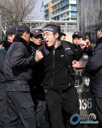 "영화계 총파업 강행도 고려하고 있다". 스크린쿼터 사수를 위해 1인 시위 15번째 주자로 나선 전국영화산업노동조합 최진욱 위원장이 정부의 스크린쿼터 축소 움직임을 강하게 비판하며 영화 노조가 중심이 된 영화계 총파업도 불사하겠다고 밝혔다. 20일 서울 광화문 교보빌딩 앞에서 오후 1시부터 1인 시위에 들어간 최진욱 위원장은 "스크린쿼터 축소를 이용해 한미 FTA(자유무역협정)협상을 시도하려는 정부의 태도는 바로 제2의 한일 합방처럼 한국이 미국에문화적으로 종속되는 것을 의미한다"며 "한미 FTA는 본질적으로 미국 자본에 종속되는 그 자체다"라고 정부를 강하게 비판했다. 최 위원장은 이어 "정부가 영화계의 반대에도 불구하고 일방적으로 스크린쿼터 축소를 밀고나가려 했을 때 시기는 밝힐 수 없으나 영화계가 총파업을 통해 스크린쿼터를 반드시 사수하겠다"고 영화인들의 확고한 의지를 밝혔다. 또한 최 위원장은 일각에서 영화계 양극화를 이유로 스크린쿼터 축소에 찬성하는 여론이 있는 것에 대해 "스크린쿼터는 미국 영화의 독과점으로부터 한국영화를 보호하는 장치"이고 "영화계 내부의 부익부 빈익빈 문제는 노사간에 내부적으로 해결해야 할 사안"이기에 둘 사이를 연계해 논점이 흐려지는 것을 막아야 한다고 주장했다. 약 30분간 교보빌딩 앞에서 1인 시위를 벌인 최 위원장은 곧 바로 미국 대사관 앞으로 이동했다. 이 과정에서 최 위원장이 시위를 제지하는 전투경찰과 미 대사관 옆 정보통신부 건물 앞에서 몸싸움을 벌이기도 했지만 불상사를 우려한 경찰이 곧 바로 물러섰다. 글, 사진=강성곤 기자 sunggon@osen.co.kr 전국영화산업노동조합 최진욱 위원장(가운데 머리띠 두른자)이 미 대사관 앞에서 스크린쿼터 사수를 위한 1인 시위를 벌이려다 전투경찰의 제지를 받고 심하게 몸싸움을 벌이고 있다. [Copyright ⓒ 한국 최고의 스포츠 엔터테인먼트 전문 미디어 OSEN(www.osen.co.kr) 제보및 보도자료 osenstar@osen.co.kr 무단전재 및 재배포 금지]