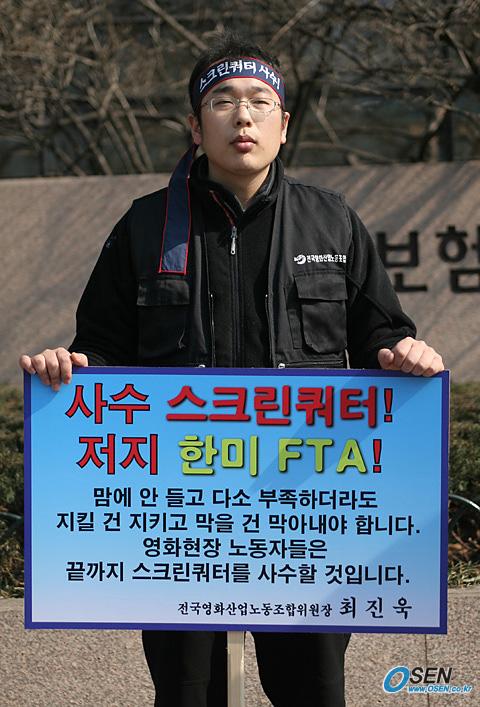 전국영화산업노동조합 최진욱 위원장이 20일 오후 1시 서울 광화문 교보빌딩 앞에서 스크린쿼터 사수를 위한 1인 시위를 벌이고 있다./강성곤 기자 sunggon@osen.co.kr [Copyright ⓒ 한국 최고의 스포츠 엔터테인먼트 전문 미디어 OSEN(www.osen.co.kr) 제보및 보도자료 osenstar@osen.co.kr 무단전재 및 재배포 금지]