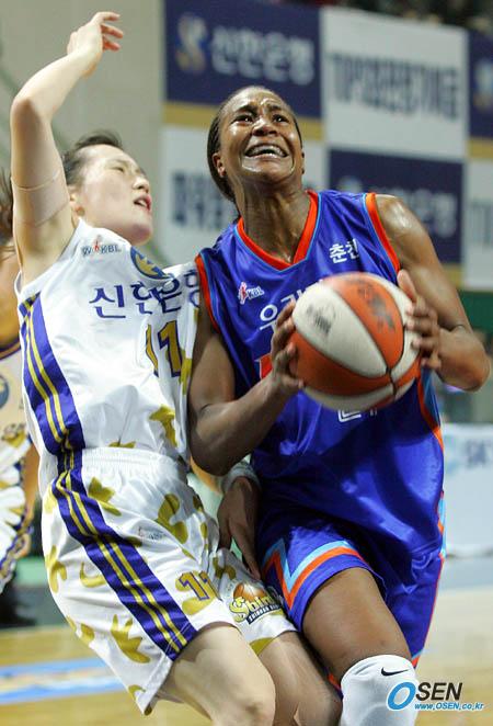 21일 안산 와동체육관에서 벌어진 2006 금호아시아나배 여자 프로농구 겨울리그 최종일 신한은행-우리은행 전서 우리은행의 최고 용병 타미카 캐칭이 신한은행 선수진의 마크를 제치며 골밑으로 전진하고 있다./안산=주지영 기자 jj0jj0@osen.co.kr [Copyright ⓒ 한국 최고의 스포츠 엔터테인먼트 전문 미디어 OSEN(www.osen.co.kr) 무단전재 및 재배포 금지]