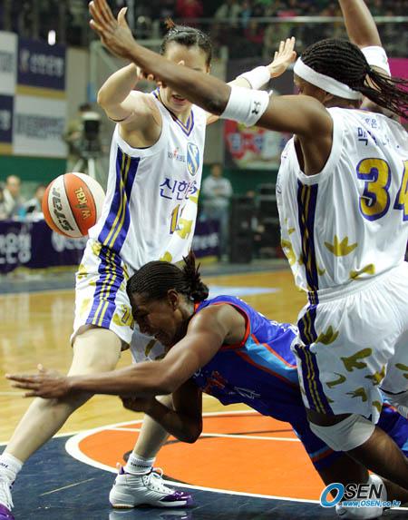 21일 안산 와동체육관에서 벌어진 2006 금호아시아나배 여자 프로농구 겨울리그 최종일 신한은행-우리은행 전서 우리은행의 타미카 캐칭이 볼을 놓치며 넘어지는 순간 신한은행의 선수진과 타즈 맥윌리암스가 두 팔을 올리며 파울하지 않았다는 제스처를 취하고 있다./안산=주지영 기자 jj0jj0@osen.co.kr [Copyright ⓒ 한국 최고의 스포츠 엔터테인먼트 전문 미디어 OSEN(www.osen.co.kr) 무단전재 및 재배포 금지]