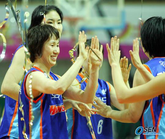 21일 안산 와동체육관에서 벌어진 2006 금호아시아나배 여자 프로농구 겨울리그 최종일 신한은행-우리은행전서 70-66으로 이겨 정규리그 우승을 차지한 우리은행의 주부 선수 김영옥이 후배들과 하이파이브를 나누고 있다./안산=주지영 기자 jj0jj0@osen.co.kr [Copyright ⓒ 한국 최고의 스포츠 엔터테인먼트 전문 미디어 OSEN(www.osen.co.kr) 무단전재 및 재배포 금지]
