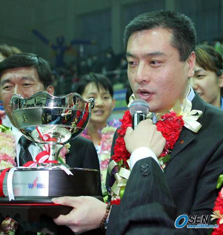 21일 안산 와동체육관에서 벌어진 2006 금호아시아나배 여자 프로농구 겨울리그 최종일 신한은행-우리은행전서 70-66으로 승리, 정규리그 우승을 차지한 우리은행의 박명수 감독이 트로피를 들고 소감을 말하고 있다./안산=주지영 기자 jj0jj0@osen.co.kr [Copyright ⓒ 한국 최고의 스포츠 엔터테인먼트 전문 미디어 OSEN(www.osen.co.kr) 무단전재 및 재배포 금지]