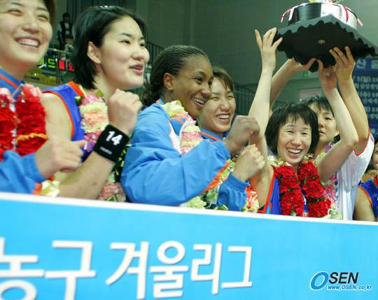 21일 안산 와동체육관에서 벌어진 2006 금호아시아나배 여자 프로농구 겨울리그 최종일 신한은행-우리은행전서 70-66으로 승리, 정규리그 우승을 차지한 우리은행 선수들이 기뻐하며 트로피를 들어 올리고 있다./안산=주지영 기자 jj0jj0@osen.co.kr [Copyright ⓒ 한국 최고의 스포츠 엔터테인먼트 전문 미디어 OSEN(www.osen.co.kr) 무단전재 및 재배포 금지]