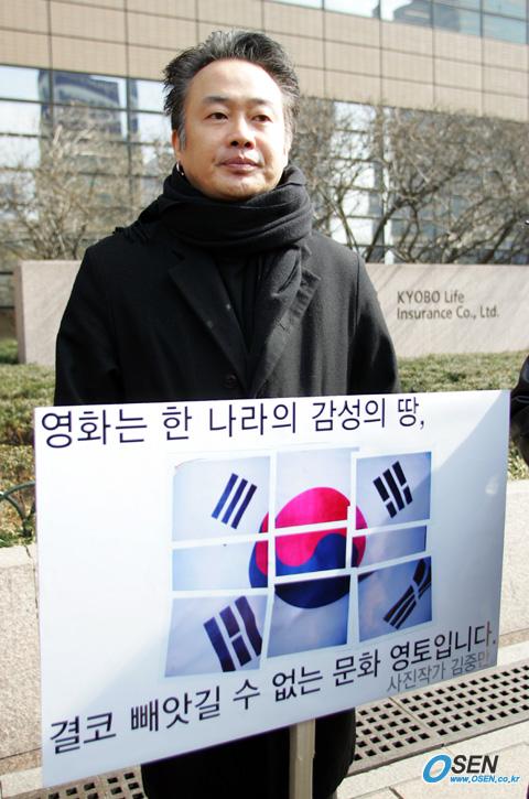 "일본, 동남아, 유럽의 한류는 다르다. 프랑스 파리의 한 잡지가 한류의 힘이 무엇이냐는 질문을 했더니 1위가 김기덕 감독, 2위가 임권택 감독, 그리고 3위가 삼성 애니콜이었다." 사진작가 김중만 씨가 영화인들이 벌이고 있는 스크린쿼터 사수 1인 시위에 동참하기 위해 피켓을 들고 거리로 나섰다. 영화인이 아닌 문화예술계 인물이 1인 시위에 나선 것은 이번이 처음이다. 22일 오후 1시 5분부터 서울 광화문 교보빌딩 앞에서 17번째 시위자로 나선 김 씨는 한국을 세계에 알리는 힘은 다양하며 그중 유럽에서는 한국 영화감독이 한국을 대변한다고 밝혔다. 김 씨는 "일부에서 경제가 문화보다 우위 한다는 인식이 있는데 이는 잘못"이라며 "유럽에서 한국문화를 대변하는 영화 감독들이 한국을 알리는데 더 큰 노력을 하고 있다"고 말했다. 사진작가이면서도 스크린쿼터 시위에 나선 이유에 대해서는 "영화인들의 스크린쿼터 사수 1인 시위가 그들만의 문제로, 또 집단 이기주의로 매도되는 것 같아 안타까워 우리 문화를 지키고자 하는 뜻에서 자발적으로 나섰다"고 답했다. 이번 스크린쿼터 문제를 보며 조각난 한국문화를 보는 것 같은 느낌에 태극기를 폴라로이드 카메라 9장으로 찍은 사진을 피켓 한 가운데 사용한 김 씨는 모든 국민들이 한국영화를 사랑하고 보살펴야 한국문화가 세계 속에서 더 큰 한류가 될 것이라고 말했다. /글=강성곤 기자 sunggon@osen.co.kr, 사진=주지영 기자 jj0jj0@osen.co.kr 사진작가 김중만 씨가 문화예술계 인물로는 처음으로 스크린쿼터 사수 1인 시위에 동참했다. 시위자 중 처음으로 이미지를 피켓에 사용한 김 씨는 한국문화가 세계를 알릴 수 있도록 힘을 실어 달라고 했다. [Copyright ⓒ 한국 최고의 스포츠 엔터테인먼트 전문 미디어 OSEN(www.osen.co.kr) 제보및 보도자료 osenstar@osen.co.kr 무단전재 및 재배포 금지]