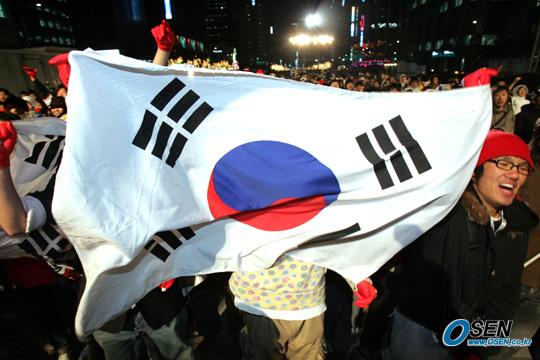 22일 저녁 청계광장에서 2007 아시안컵 2차 예선 한국의 첫 경기인 시리아전 길거리 응원이 펼쳐졌다. 한국이 전반을 1-0으로 앞서자 시민들이 태극기를 들고 흥겹게 응원하고 있다./박영태 기자 ds3fan@osen.co.kr [Copyright ⓒ 한국 최고의 스포츠 엔터테인먼트 전문 미디어 OSEN(www.osen.co.kr) 무단전재 및 재배포 금지]