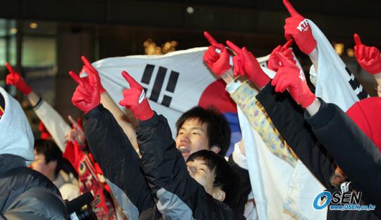 22일 저녁 청계광장에서 2007 아시안컵 2차 예선 한국의 첫 경기인 시리아전 길거리 응원이 펼쳐졌다. 빨간 장갑을 끼고 나온 팬들이 하늘을 찌르는 포즈를 취하며 응원하고 있다./박영태 기자 ds3fan@osen.co.kr [Copyright ⓒ 한국 최고의 스포츠 엔터테인먼트 전문 미디어 OSEN(www.osen.co.kr) 무단전재 및 재배포 금지]