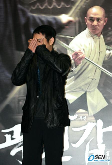 23일 서울극장에서 중국무협액션스타 이연걸이 액션연기 은퇴를 선언하며 마지막으로 촬영한 영화 ‘무인 곽원갑'의 기자 시사회가 열렸다. 10년만에 한국을 방문한 이연걸이 취재진들의 카메라 플래시가 터지자 눈이 부신지 눈을 가리고 있다./박영태기자 ds3fan@osen.co.kr [Copyright ⓒ 한국 최고의 스포츠 엔터테인먼트 전문 미디어 OSEN(www.osen.co.kr) 제보및 보도자료 osenstar@osen.co.kr 무단전재 및 재배포 금지]