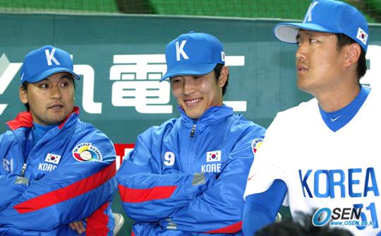 25일 일본 후쿠오카 야후돔에서 열린 2006 WBC 한국대표팀과 롯데 자이언츠의 연습경기 후 지난 24일 밤에야 합류한 빅리거 5인이 합동으로 인터뷰하고 있다. '언제 선발로 나갔으면 좋겠냐"는 질문에 김선우가 "일본전" 이라고 대답하자 옆에 있던 김병현이 웃음을 띠고 있다./후쿠오카=박영태 기자 ds3fan@osen.co.kr [Copyright ⓒ 한국 최고의 스포츠 엔터테인먼트 전문 미디어 OSEN(www.osen.co.kr) 무단전재 및 재배포 금지]