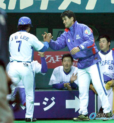 25일 일본 후쿠오카 야후돔에서 열린 2006 WBC 한국대표팀과 롯데 자이언츠의 연습경기에서 이종범이 빠른발을 이용해 득점을 올리고 덕아웃으로 들어오자 박찬호가 다가가서 하이파이브를 나누고 있다./후쿠오카=박영태 기자 ds3fan@osen.co.kr [Copyright ⓒ 한국 최고의 스포츠 엔터테인먼트 전문 미디어 OSEN(www.osen.co.kr) 무단전재 및 재배포 금지]