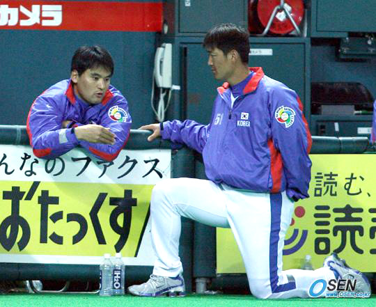 25일 일본 후쿠오카 야후돔에서 열린 2006 WBC 한국대표팀과 롯데 자이언츠의 연습경기 도중 덕아웃에서 박찬호(왼쪽)가 김선우와 투구 동작 등에 대해 이야기를 나누고 있다./후쿠오카=박영태 기자 ds3fan@osen.co.kr [Copyright ⓒ 한국 최고의 스포츠 엔터테인먼트 전문 미디어 OSEN(www.osen.co.kr) 무단전재 및 재배포 금지]