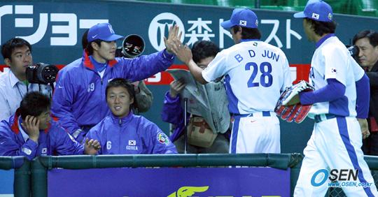 25일 일본 후쿠오카 야후돔에서 열린 2006 WBC 한국대표팀과 롯데 자이언츠의 연습경기에서 김병현이 이닝을 끝내고 덕아웃으로 들어오는 전병두와 하이파이브를 나누고 있다./후쿠오카=박영태 기자 ds3fan@osen.co.kr [Copyright ⓒ 한국 최고의 스포츠 엔터테인먼트 전문 미디어 OSEN(www.osen.co.kr) 무단전재 및 재배포 금지]