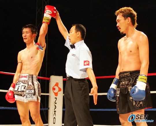25일 부산 벡스코 특설링에서 열린 K-1 파이팅 네트워크 KHAN 2006 대회 4회전 문정웅과 가류싱고의 연장전에서 주심이 문정웅의 팔을 올려 승리를 선언하고 있다./부산=주지영 기자 jj0jj0@osen.co.kr [Copyright ⓒ 한국 최고의 스포츠 엔터테인먼트 전문 미디어 OSEN(www.osen.co.kr) 무단전재 및 재배포 금지]