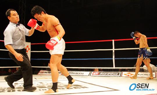 25일 부산 벡스코 특설링에서 열린 K-1 파이팅 네트워크 KHAN 2006 대회 임치빈(왼쪽)과 박성환의 준결승 1회전서 경기중 버팅으로 서로 머리를 만지며 괴로워 하고 있다./부산=주지영 기자 jj0jj0@osen.co.kr [Copyright ⓒ 한국 최고의 스포츠 엔터테인먼트 전문 미디어 OSEN(www.osen.co.kr) 무단전재 및 재배포 금지]