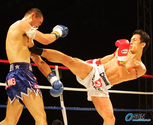 25일 부산 벡스코 특설링에서 열린 K-1 파이팅 네트워크 KHAN 2006 대회 임치빈과 박성환의 준결승 1경기서 임치빈(오른쪽)이 미들킥으로 박성환을 공격하고 있다./부산=주지영 기자 jj0jj0@osen.co.kr [Copyright ⓒ 한국 최고의 스포츠 엔터테인먼트 전문 미디어 OSEN(www.osen.co.kr) 무단전재 및 재배포 금지]
