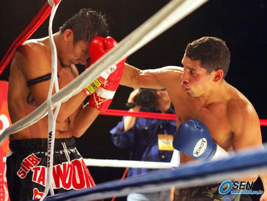 25일 부산 벡스코 특설링에서 열린 K-1 파이팅 네트워크 KHAN 2006 대회 버질 칼라코다와 신비태웅의 슈퍼파이트 1경기서 버질 칼라코다가 신비 태웅을 라이트 훅으로 공격하고 있다./부산=주지영 기자 jj0jj0@osen.co.kr [Copyright ⓒ 한국 최고의 스포츠 엔터테인먼트 전문 미디어 OSEN(www.osen.co.kr) 무단전재 및 재배포 금지]