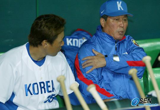 26일 일본 후쿠오카 야후돔에서 벌어진 한국 WBC 대표팀과 롯데 자이언츠의 연습 경기에 앞서 덕아웃에 앉아 있던 김인식 감독이 옆 자리의 이승엽에 아픈 부위를 가리키고 있다./후쿠오카=박영태 기자 ds3fan@osen.co.kr [Copyright ⓒ 한국 최고의 스포츠 엔터테인먼트 전문 미디어 OSEN(www.osen.co.kr) 무단전재 및 재배포 금지]