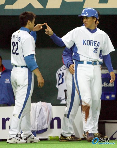 26일 일본 후쿠오카 야후돔에서 벌어진 한국 WBC 대표팀과 롯데 자이언츠의 연습 경기에서 8회 3루타를 치고 나간 뒤 김동주의 적시타로 홈을 밟은 이승엽이 홍성흔과 손가락으로 하이파이브하고 있다/후쿠오카=박영태 기자 ds3fan@osen.co.kr [Copyright ⓒ 한국 최고의 스포츠 엔터테인먼트 전문 미디어 OSEN(www.osen.co.kr) 무단전재 및 재배포 금지]
