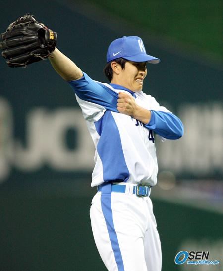 26일 일본 후쿠오카 야후돔에서 벌어진 한국 WBC 대표팀과 롯데 자이언츠의 연습 경기에 대표팀이 3-2로 앞서던 9회 마무리로 등판한 김병현이 연속 안타를 허용하자 팔소매를 걷어 붙이고 있다./후쿠오카=박영태 기자 ds3fan@osen.co.kr [Copyright ⓒ 한국 최고의 스포츠 엔터테인먼트 전문 미디어 OSEN(www.osen.co.kr) 무단전재 및 재배포 금지]