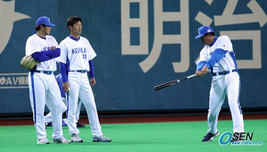 26일 일본 후쿠오카의 야후돔에서 벌어진 한국 WBC 대표팀과 롯데 자이언츠의 연습 경기에 앞서 외야에서 김선우 서재응에게 투구 동작을 설명하던 선동렬 투수코치가 배팅 폼을 잡아 보이고 있다./후쿠오카=박영태 기자 ds3fan@osen.co.kr [Copyright ⓒ 한국 최고의 스포츠 엔터테인먼트 전문 미디어 OSEN(www.osen.co.kr) 무단전재 및 재배포 금지]