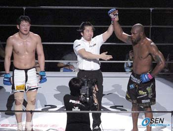 프라이드 무대 첫 승을 노리는 윤동식에게 있어서 미국의 퀸튼 '램피지' 잭슨은 너무나 버거운 상대였다. 윤동식은 26일 일본 사이타마 슈퍼 어리나에서 열린 프라이드 31 대회 제2경기에 출전, 미국의 잭슨과 맞서 비교적 선전을 펼쳤지만 이렇다 할 공격을 보여주지 못한채 심판 전원일치 판정패를 당했다. 이로써 윤동식은 지난해 4월 23일 오사카돔에서 열렸던 프라이드 그랑프리 2005 개막전에서 사쿠라바 가즈시에게 1라운드 KO패, 지난해 10월 23일 사이타마 슈퍼어리나에서 열린 프리이드 30 대회에서 다키모토 마코토에게 판정패한 이후 3전 전패를 기록하며 데뷔 첫 승을 거두는 데 또 실패했다. 윤동식은 1라운드 먼저 공격을 걸었지만 잭슨의 힘에 밀려 오히려 링 바닥에 쓰러지며 역전당했고 1라운드 10분 내내 그라운딩 자세로 공격당한채 끝냈다. 2라운드에서도 윤동식은 잭슨의 노련미와 힘을 당해내지 못한 윤동식은 3라운드 2분께 코너에서 잭슨을 위로 누르며 공격자세를 취하는 데 성공했지만 이후 오히려 자세를 역전당하며 어려운 경기를 펼쳤다. 결과는 의문의 여지가 없는 심판 전원일치 판정패. 하지만 잭슨의 무시무시한 공격력을 20분동안 버텼다는 점에서 윤동식이 앞으로 프라이드 무대에서 자신감을 갖기에는 충분했다. 이날 윤동식은 자신의 데뷔전 KO패를 안겼던 사쿠라바를 세컨드로 데리고 나와 눈길을 끌었다. 한편 제1경기에서는 러시아의 로만 젠소프가 브라질의 페드로 히조에게 펀치 한방으로 KO승을 거뒀다. 히조가 오른발 로킥을 시도할 때 젠소프가 수비가 비어있는 히조의 오른쪽 안면을 향해 왼손 주먹을 날렸고 이것이 그대로 적중되며 싱겁게 경기가 끝나고 말았다. ■ 프라이드 31 경기 결과 ▲ 제1경기 로만 젠소프 1라운드 KO승 페드로 히조 ▲ 제2경기 퀸튼 '램피지' 잭슨 3-0 윤동식 박상현 기자 tankpark@osen.co.kr 주심이 잭슨의 손을 들어주고 있다./사이타마=송석린 기자 song@osen.co.kr [Copyright ⓒ 한국 최고의 스포츠 엔터테인먼트 전문 미디어 OSEN(www.osen.co.kr) 무단전재 및 재배포 금지]