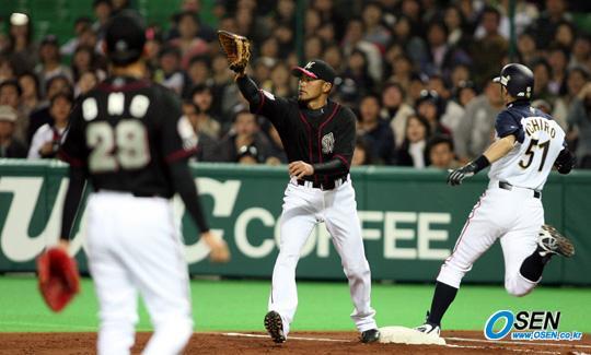 월드베이스볼클래식(WBC)에 출전하는 일본대표팀이 작년 일본시리즈 우승팀인 롯데 마린스를 완파하고 연습경기 전적 2승 1패를 기록했다. 일본대표팀은 26일 밤 후쿠오카 야후돔에서 가진 롯데와의 평가전에서 전날 프로선발팀과의 경기보다 공수에서 훨씬 향상된 모습을 보이며 5-1로 완승을 거뒀다. 일본은 선발인 언더핸드 와타나베(롯데)가 4이닝을 무실점으로 쾌투하는 등 투수진이 안정된 투구를 펼치고 타선의 고른 활약으로 주축 선수들이 대표팀에 차출된 롯데를 완파했다. 타자 중에서는 이치로(시애틀) 가와사키(소프트뱅크) 등 빠른 발과 정확한 타격을 자랑하는 타자들이 활발히 공격을 주도했다. 또 3회 솔로 홈런을 날린 오가사와라(니혼햄)와 2루타를 때린 마쓰나카(소프트뱅크)의 장타력도 돋보였다. 일본 대표팀은 1회와 2회 1점씩을 뽑으며 기선을 제압한 뒤 3회 오가사와라 솔로포로 한 점을 더 달아나고 5회 가와사키의 적시타 등으로 2점을 추가해 5-0으로 승리를 굳혔다. 일방적으로 눌려 있던 롯데는 스기우치(한신)로부터 6회 1점을 뽑아 간신히 영패를 모면했다. 후쿠오카(일본)=글, 박선양 기자 sun@osen.co.kr 사진, 박영태 기자 ds3fan@osen.co.kr 26일 롯데 마린스와의 연습경기서 빠른 발을 이용해 내야안타로 출루하는 이치로 [Copyright ⓒ 한국 최고의 스포츠 엔터테인먼트 전문 미디어 OSEN(www.osen.co.kr) 무단전재 및 재배포 금지]