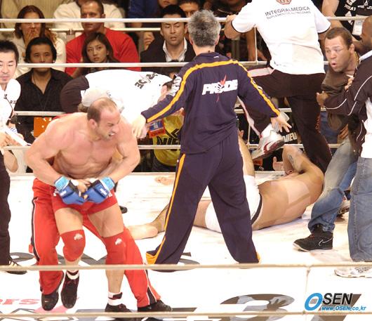 일본 사이타마 슈퍼어리나에서 26일 열린 프라이드 FC 31 제8경기서 탈골로 이미 기권을 선언한 마우리시우 쇼군을 마크 콜먼이 공격하자 관중석에 있던 반다레이 실바가 링위로 뛰어 올라 마크 콜먼에게 달려가고 있다. 쇼군은 마크 콜먼의 태클 공격때 오른손을 잘 못 짚어 팔이 완전히 꺽이는 부상을 당했다./사이타마=송석린기자 song@osen.co.kr [Copyright ⓒ 한국 최고의 스포츠 엔터테인먼트 전문 미디어 OSEN(www.osen.co.kr) 무단전재 및 재배포 금지]