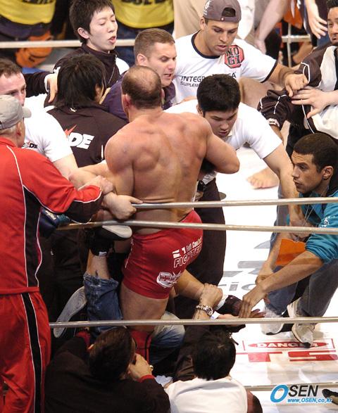 일본 사이타마 슈퍼어리나에서 26일 열린 프라이드 FC 31 제8경기서 탈골로 이미 기권을 선언한 마우리시우 쇼군을 마크 콜먼이 공격하자 쇼군과 같은 도장 소속인 반덜레이 실바가 링위로 뛰어 올라 마크 콜먼과 몸싸움을 벌이다 링 바닥에 넘어져 있다. 쇼군은 마크 콜먼의 태클 공격때 오른손을 잘 못 짚어 팔이 완전히 꺽이는 부상을 당했다./사이타마=송석린 기자 song@osen.co.kr [Copyright ⓒ 한국 최고의 스포츠 엔터테인먼트 전문 미디어 OSEN(www.osen.co.kr) 무단전재 및 재배포 금지]