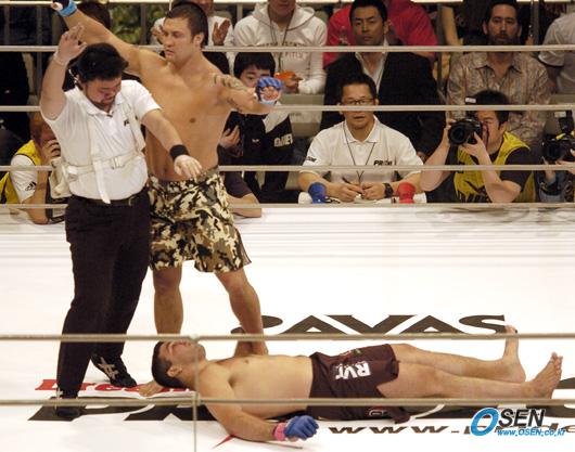26일 일본 사이타마 슈퍼 어리나에서 열린 프라이드 FC 31 대회 제1경기서 러시아의 로만 젠소프가 브라질의 페드로 히조를 왼손 펀치 한 방으로 1라운드에 KO시켰다./사이타마=송석린 기자 song@osen.co.kr [Copyright ⓒ 한국 최고의 스포츠 엔터테인먼트 전문 미디어 OSEN(www.osen.co.kr) 무단전재 및 재배포 금지]