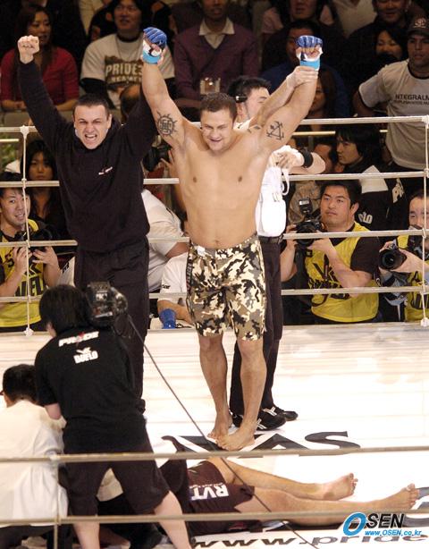 26일 일본 사이타마 슈퍼 어리나에서 열린 프라이드 FC 31 대회 제1경기서 브라질의 페드로 히조를 1라운드에 왼손 한 방으로 KO시킨 러시아의 로만 젠소프가 세컨드와 함께 환호하고 있다./사이타마=송석린 기자song@osen.co.kr [Copyright ⓒ 한국 최고의 스포츠 엔터테인먼트 전문 미디어 OSEN(www.osen.co.kr) 무단전재 및 재배포 금지]