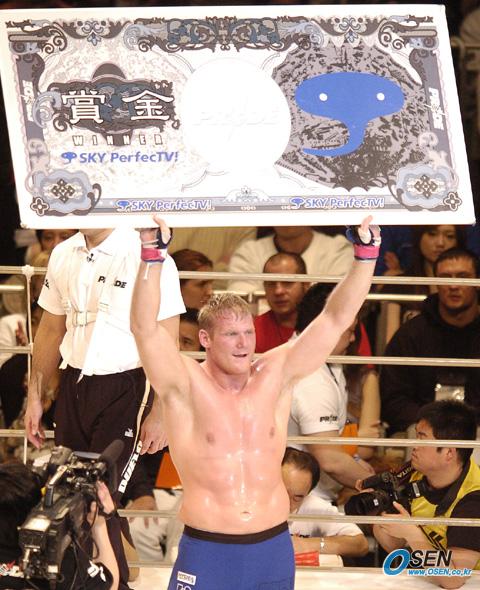 26일 일본 사이타마 슈퍼아레나에서 열린 종합격투기 '프라이드FC 31' 제6경기 조쉬 바넷이 나카무라 카즈히로를 리어 네이키드 초크로 기권승을 거두었다. 조쉬 바넷이 상금을 번쩍 치켜들고 좋아하고 있다./사이타마=송석린기자song@osen.co.kr [Copyright ⓒ 한국 최고의 스포츠 엔터테인먼트 전문 미디어 OSEN(www.osen.co.kr) 무단전재 및 재배포 금지]