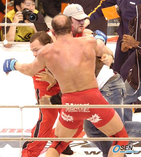 일본 사이타마 슈퍼어리나에서 26일 열린 프라이드 FC 31 제8경기서 탈골로 이미 기권을 선언한 마우리시우 쇼군을 마크 콜먼이 공격하자 관중석에 있던 반덜레이 실바가 링위로 뛰어 올라 마크 콜먼에게 달려가고 있다. 쇼군은 마크 콜먼의 태클 공격때 오른손을 잘 못 짚어 팔이 완전히 꺽이는 부상을 당했다./사이타마=송석린 기자 song@osen.co.kr [Copyright ⓒ 한국 최고의 스포츠 엔터테인먼트 전문 미디어 OSEN(www.osen.co.kr) 무단전재 및 재배포 금지]