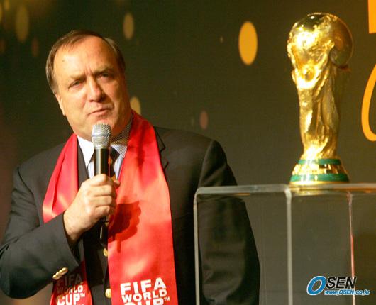 28일 오전 서울 하얏트 호텔에서 FIFA 월드컵 트로피 진품이 국내 최초로 공개돼 찬란한 황금빛을 발하고 있다. 코카콜라가 주관한 월드컵 트로피 투어의 일환으로 한국을 찾은 진품을 바라보며 딕 아드보카트 대표팀 감독이 발언하고 있다./손용호 기자 spjj@osen.co.kr [Copyright ⓒ 한국 최고의 스포츠 엔터테인먼트 전문 미디어 OSEN(www.osen.co.kr) 무단전재 및 재배포 금지]