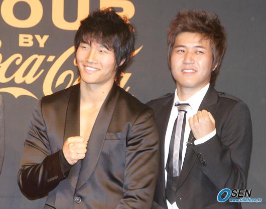 28일 오전 서울 하얏트 호텔에서 FIFA 월드컵 트로피 진품이 국내 최초로 공개돼 찬란한 황금빛을 발하고 있다. 코카콜라가 주관한 월드컵 트로피 투어의 일환으로 한국서 열린 이날 행사에 TV 프로그램에 등장하는 FC 슛돌이 축구단의 감독과 코치를 맞고 있는 가수 김종국(왼쪽)과 김종민이 파이팅을 외치고 있다. /손용호 기자spjj@osen.co.kr [Copyright ⓒ 한국 최고의 스포츠 엔터테인먼트 전문 미디어 OSEN(www.osen.co.kr) 무단전재 및 재배포 금지]