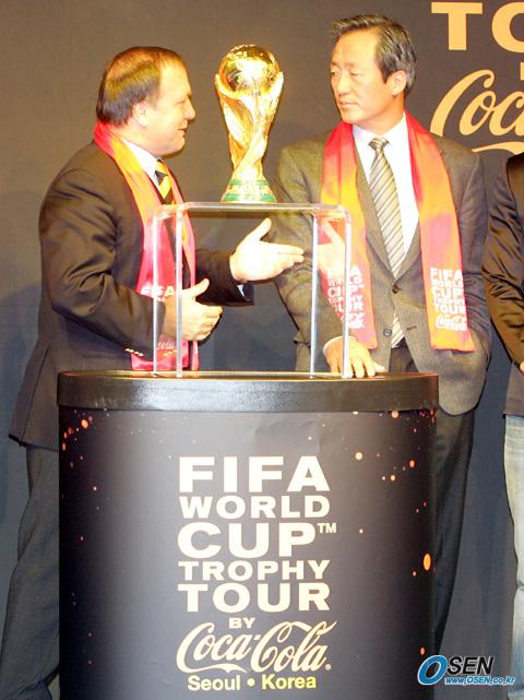 28일 오전 서울 하얏트 호텔에서 FIFA 월드컵 트로피 진품이 국내 최초로 공개돼 찬란한 황금빛을 발하고 있다. 코카콜라가 주관한 월드컵 트로피 투어의 일환으로 한국을 찾은 진품을 사이에 놓고 딕 아드보카트 대표팀 감독과 정몽준 대한축구협회장이 얘기를 나누고 있다./손용호 기자 spjj@osen.co.kr [Copyright ⓒ 한국 최고의 스포츠 엔터테인먼트 전문 미디어 OSEN(www.osen.co.kr) 무단전재 및 재배포 금지]