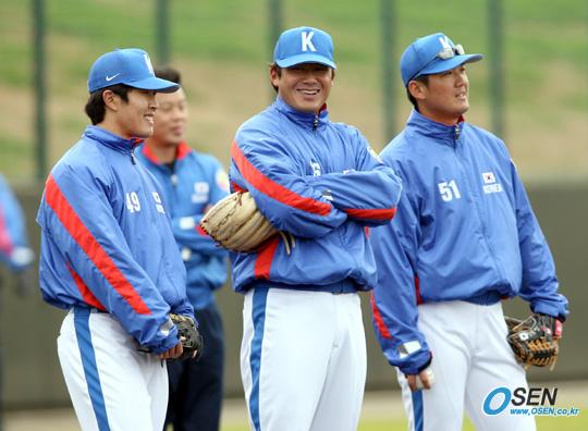 27일 일본 후쿠오카의 간노스구장에서 2006 WBC 한국대표팀이 자체 청백전을 가졌다. 경기전 연습에서 김병현(왼쪽부터),서재응,김선우가 점퍼를 입고 훈련모습을 바라보고 있다./후쿠오카=박영태기자 ds3fan@osen.co.kr [Copyright ⓒ 한국 최고의 스포츠 엔터테인먼트 전문 미디어 OSEN(www.osen.co.kr) 무단전재 및 재배포 금지]