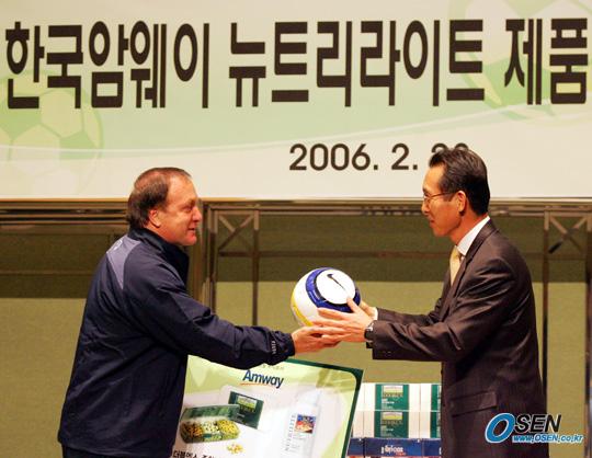 28일 낮 서울 홍은동 그랜드힐튼 호텔에서 축구대표 선수들의 집단 인터뷰가 끝난 뒤 한국 암웨이에서 기능성 건강 식품을 전달하자 아드보카트 감독이 한국 암웨이 나봉룡 전무에게 선수들이 사인한 볼을 선물하고 있다./주지영 기자 jj0jj0@osen.co.kr [Copyright ⓒ 한국 최고의 스포츠 엔터테인먼트 전문 미디어 OSEN(www.osen.co.kr) 무단전재 및 재배포 금지]