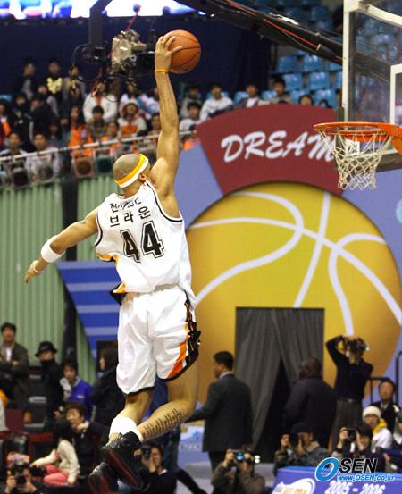 28일 잠실체육관에서 열린 2005-2006 KCC 프로농구 올스타전 하프타임 때 거행된 덩크슛 컨테스트 결승서 전자랜드의 안드레 브라운이 프리스로 라인 부근서 점프해 덩크슛을 꽂고 있다./잠실체=박영태 기자 ds3fan@osen.co. [Copyright ⓒ 한국 최고의 스포츠 엔터테인먼트 전문 미디어 OSEN(www.osen.co.kr) 무단전재 및 재배포 금지]