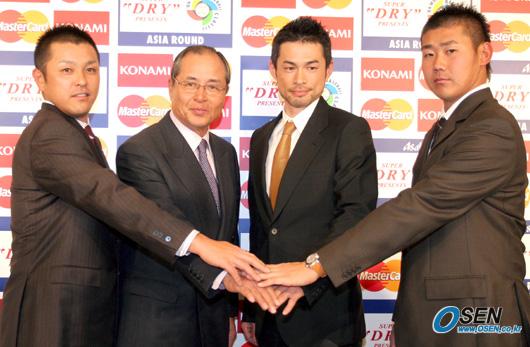 일본 WBC 대표팀이 28일 오후 도쿄돔 호텔에서 기자회견을 가졌다. 회견이 끝나고 다니시게, 왕정치 감독,이치로, 마쓰자카(왼쪽부터)가 손을 한 데 모으고 선전을 다짐하고 있다./도쿄돔=손용호 기자 spjj@osen.co.kr [Copyright ⓒ 한국 최고의 스포츠 엔터테인먼트 전문 미디어 OSEN(www.osen.co.kr) 무단전재 및 재배포 금지]