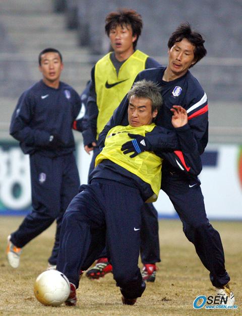 국가대표팀이 앙골라전을 하루 앞두고 28일 저녁 서울 상암 월드컵경기장에서 훈련을 실시했다. 이동국이 김상식과 볼을 다투다 넘어지고 있다. 뒤에서 김영철과 최태욱이 바라보고 있다./상암=주지영 기자 jj0jj0@osen.co.kr [Copyright ⓒ 한국 최고의 스포츠 엔터테인먼트 전문 미디어 OSEN(www.osen.co.kr) 무단전재 및 재배포 금지]