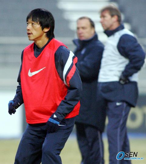 국가대표팀이 앙골라전을 하루 앞두고 28일 저녁 서울 상암 월드컵경기장에서 훈련을 실시했다. 아드보카트 감독이 김남일에게 빨간 조끼를 입혀 노란 조끼를 입은 팀과 조끼를 입지 않은 팀 사이에 투입한 뒤 플레이를 지켜보고 있다./상암=주지영 기자 jj0jj0@osen.co.kr [Copyright ⓒ 한국 최고의 스포츠 엔터테인먼트 전문 미디어 OSEN(www.osen.co.kr) 무단전재 및 재배포 금지]